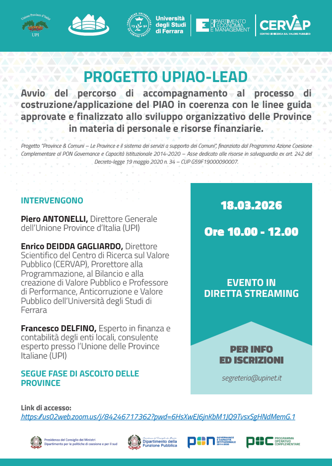 A partire da marzo 2026 sarà avviato, nell’ambito del progetto “Province & Comuni”, il percorso “UPIAO-lead”, finalizzato a supportare le Province nell’attuazione dei Piani Integrati di Attività e Organizzazione (PIAO), con l’obiettivo di migliorare l’efficacia e l’efficienza della gestione delle funzioni provinciali e delle attività di supporto ai Comuni. Il progetto, realizzato dal Centro di Ricerca sul Valore Pubblico (CERVAP) dell’Università di Ferrara in collaborazione con UPI, prevede un’azione di semplificazione dei contenuti del PIAO attraverso la predisposizione di strumenti operativi a supporto della programmazione. In particolare saranno sviluppati: una matrice di sintesi delle Linee guida e del Manuale operativo per le Province con l’indicazione degli standard minimi per un PIAO di qualità; una proposta di Obiettivi di Valore Pubblico Territoriale; schede descrittive del sistema degli indicatori; un’architettura programmatica integrata tra DUP, PEG e PIAO; e un tableau di supporto alla programmazione delle performance organizzative e individuali di dirigenti ed elevate qualificazioni, in coerenza con gli obiettivi di valore pubblico territoriale.